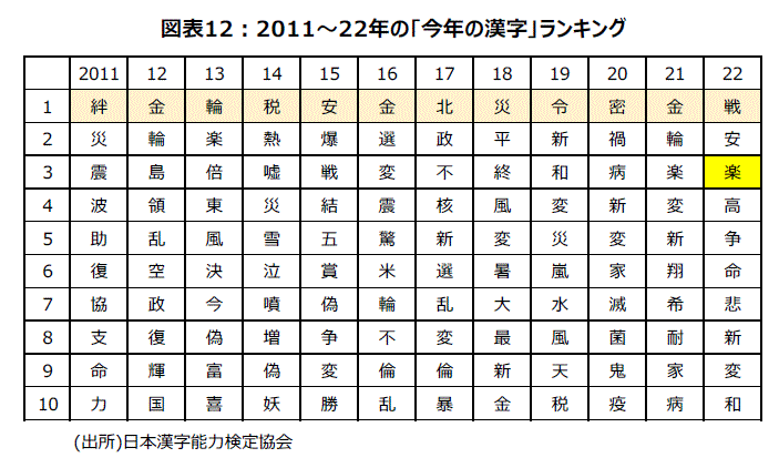 22年「今年の漢字」は「戦」になった(図表12)。現状の景気の明暗分かれる背景を映している。「戦」にはロシアのウクライナ侵攻という「戦」争や、その影響で高騰したエネルギー・穀物を主因とした物価高やコロナ禍との「戦」いという暗い面がある。一方、サッカーワールドカップや冬季オリンピックでの熱「戦」や、大谷翔平選手や村上宗隆選手の記録への挑「戦」という前向きな意味もある。人々に勇気や感動をもたらし、景気にとってもプラス要因として働いたとみられる。また、今年の漢字の第3位は「楽」であった。自由に旅行などが出来ることが「楽」しいということで消費の底堅さを示唆する漢字だ。
