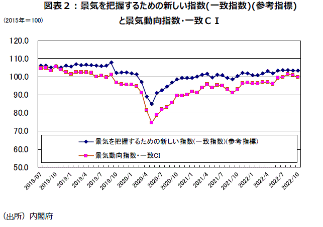 景気動向指数で景気の現状を表す一致CIは22年8月に101.3となり、コロナ禍前の19年5月102.0以来の水準に戻った。直近データの10月改定値で一致CIは99.6まで鈍化したが、19年10月~22年7月を上回る水準だ。景気を把握するための新しい指数(一致指数)は22年6月から10月まで103台と5カ月連続で19年7月(107.7)以来の水準が続いている(図表2)。景気動向指数一致CIを使った機械的な景気基調判断は21年9月~22年2月速報値では「足踏みを示している」だったが、生産関連データの年間補正などがあった2月改定値で「3カ月以上連続して、3カ月後方移動平均が上昇、かつ当月の前月差の符号がプラス」という「改善」に戻るための条件を満たし、直近10月まで「改善」の判断が9カ月連続で続いている。