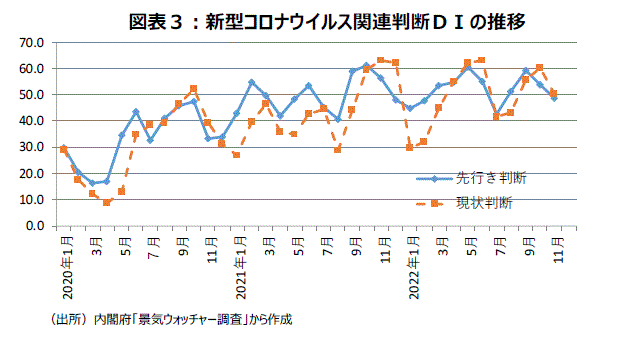 ワクチン接種の効果などで新型コロナウイルスの経済への影響が比較的小さくなり、社会経済活動が正常化に向かいつつあることは、「新型コロナウイルス」現状DIをつくるとわかる(図表3)。20年4月に8.7とほとんどが「悪くなった」の判断だったが、その後は振幅を伴いつつ上向き傾向で推移し、直近は22年9月55.7、10月60.4、11月50.5と3カ月連続で景気判断の分岐点50を上回り、やや「良い」超の状況にある。但し、現状判断DIは、10月49.9から11月は48.1へ鈍化。先行き判断DIは10月46.4から11月45.1に鈍化した。第8波の影響が年末になって強まって、コロナによる死亡者数が12月29日に420人と過去最高になってしまったこともあり、12月の結果は要注視だ。
