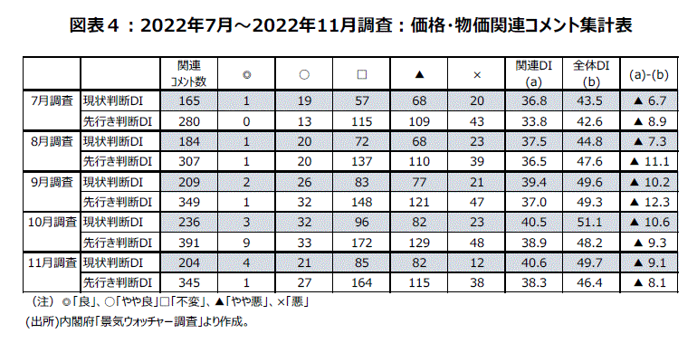 (「景気ウォッチャー調査」で、11月「価格or物価」先行き判断DI38.3、「増税」先行き判断DI30.0と厳しい数字)