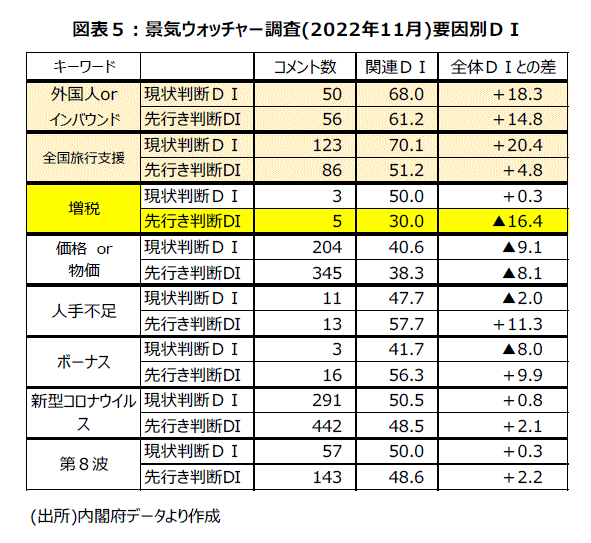東海のタクシー運転手は先行き判断を「やや悪くなる」とした。理由は「増税の噂がある」といったものだ、コメント数は5と少ないものの、「増税」先行き判断DIは30.0と厳しいものになっている。24年以降の増税が発表された後の12月調査(1月12日発表)では「増税」判断DIがどれだけ景況感の悪材料になっているか、実質的「利上げ」判断DIとともに注目したい(図表5)。