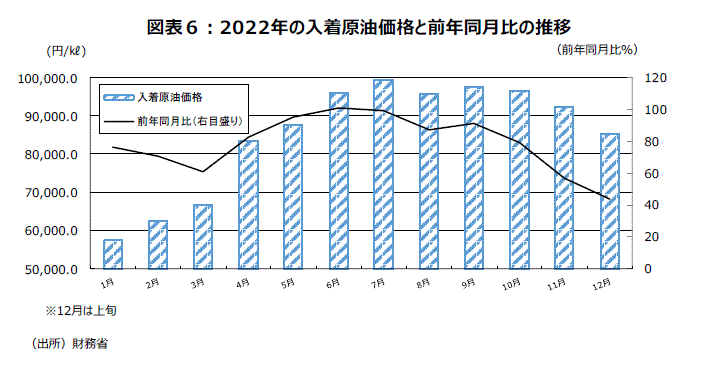 貿易統計の入着原油価格(原油及び粗油)は6・7月をピーク(6月95,881円/kl前年比+101.4%、7月99,575円/kl同+99.5%)に、11月92,345円/kl同+57.0%、12月上旬85,323円/kl同+43.8%と、水準も前年比も、円安一服と原油価格の落ち着きの影響で、直近は鈍化してきている(図表6)。