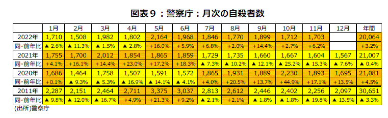 こうした動きが犯罪統計などの悪化傾向の背景とみられる。金融機関の店舗強盗事件は19年13件、20年11件、21年9件と近年は発生が少ない状況が続いてきた。しかし、22年は1~10月で15件となり、15年以来7年ぶりの前年比増加が確定している。また、刑法犯総数の認知件数は近年減少傾向で、昨年は56.8万件と前年比▲7.5%の減少だった。しかし、22年1~11月の前年比は+5.5%で、11月単月だと+12.0%と足元は増加傾向に変わった。自殺者数の前年同月比は21年7月~22年4月まで10カ月連続して減少だったが、11月暫定値段階で、22年5月~11月では7カ月連続増加になった。11月暫定値では+6.2%の増加、1~11月分では前年比+3.2%の増加である。22年は20年以来の2年ぶりの増加になりそうだ(図表9)。