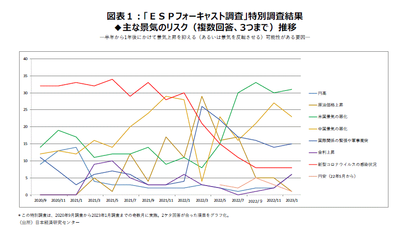 (最大の景気腰折れリスクは22年7月から23年1月調査まで4回連続「米国景気悪化」。2位は「中国景気悪化」)