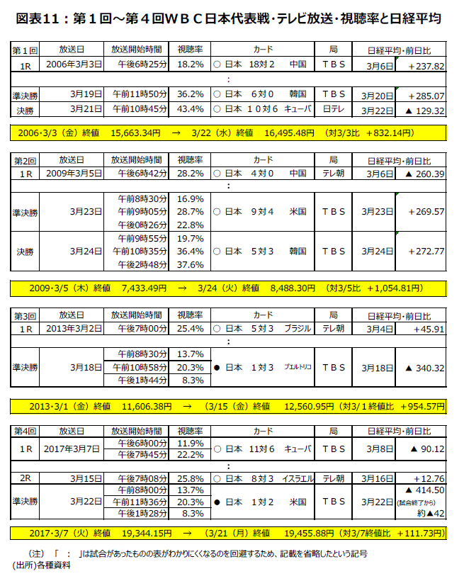 スポーツイベントで、3月に大谷翔平やダルビッシュ有らが参加する野球の国際大会WBCが開催されることは、春の株価の上昇要因になる可能性が大きい。過去4回の大会で日本は全て初戦に勝利している。日本が優勝した第1回・第2回のWBCでは、優勝を決めた決勝戦当日の日経平均株価の終値は、開幕直前の終値に比べ、第1回は832円、第2回は1,054円上昇した。第3回と第4回は準決勝敗退となったが、開幕直前の終値から準決勝直前の終値まで日経平均株価は各々955円、112円上昇した。テレビ中継が高視聴率の侍ジャパンの試合での勝利は、日本中を元気付け、株価押し上げにも貢献する傾向があるようだ(図表11)。