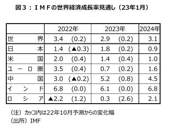 IMFは1月31日公表の世界経済見通しで、23年の世界の成長率を+2.9%と、22年10月の予想から0.2ポイント上方修正した。24年は+3.1%の見通しだ(図表3)。23年の予測は22年1月時点で+3.8%だった。翌月のウクライナ侵攻後は3回連続の下方修正で22年10月に+2.7%としていた。23年1月の予測はウクライナ情勢下で初の上方修正となった。中国のゼロコロナ政策転換による経済活動の完全な再開や、多くの国で予想よりも景気が堅調に推移していることを考慮したとみられる。ゼロコロナ政策を転換した中国の23年成長率見通しは0.8ポイントの上方修正で+5.2%の予測だ。中国国家統計局が1月31日に発表した1月の製造業PMIは50.1と、景気判断の分岐点50を4カ月ぶりに上回った。また、世界のコア・インフレ率は22年の+8.8%から、23年に+6.6%、24年は+4.3%まで低下すると予想されているが、パンデミック前の水準をまだ上回っている。 なお、中国が順調に回復した場合、インフレ面で圧力を再び強める可能性があることには要注視だろう。