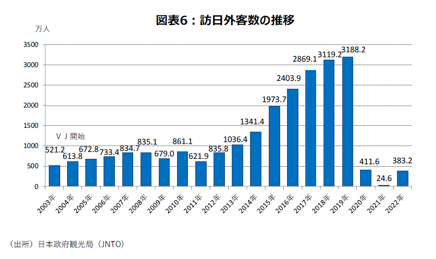 22年年間の訪日外客数は3,831,900人であった。2019年比で▲88.0%である(図表6)。6月10日から観光目的の入国受け入れ再開や、段階的な水際対策緩和がなされた。特に本格的な受け入れ再開を行った10月以降、顕著な回復が見られている。9月は訪日外客数206,641人、うち観光客は42,108人であったが、10月は訪日外客数498,646人、うち観光客は326,699人になった。11月と12月は訪日外客数だけ推計値が公表されていて、観光客の数字はわからないが、訪日外客数は各々934,500人、1,370,000人となっている。「外国人ORインバウンド」関連DIは11月68.0,12月64.6で、「全国旅行支援」現状判断DIとともに、景況感回復に寄与していることがわかる。