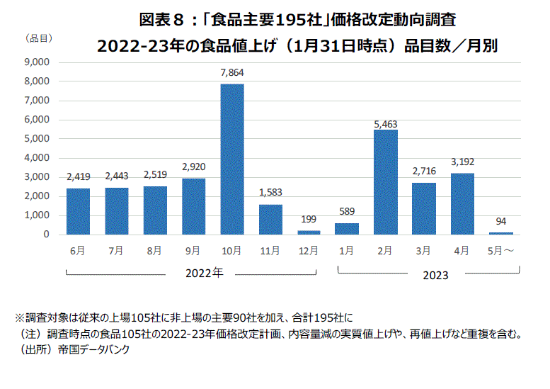 調査対象企業が90社増加した帝国データバンクの「食品主要195社」価格改定動向調査(1月31日時点)によると、22年10月は昨年では最多の7,864品目で値上げが行われた。11月は1,583品目、12月は199品目、23年1月は589品目で値上げが行われた。2月は5,463品目の予定だ。マスコミ報道からは23年1月~4月の価格改定品目は1万品目を超えると伝わり、前回発表も7,000超より相当追加されたような印象を受けるが、対象社数が86%増加していることを考慮する必要があろう。23年は今のところ一番多い2月が5,463品目で、22年10月がピークであることに変わりはない(図表8)。